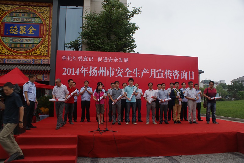 6月16日上午,揚州市安委辦會同蜀崗—瘦西湖風(fēng)景名勝區(qū)管委會在虹橋坊舉行了以“強化紅線意識,促進安全發(fā)展”為主題的2014年揚州市“安全生產(chǎn)月”宣傳咨詢?nèi)栈顒。市安委會、市安監(jiān)局、蜀岡—瘦西湖風(fēng)景名勝區(qū)管委會、市人保公司負責(zé)人出席了活動。市安監(jiān)局、揚汽集團、市城建控股集團、市工藝美術(shù)集團、金茂化工集團、揚子江集團、建工控股集團等11家單位以及消防、建筑、燃氣、氣象、質(zhì)監(jiān)、部分駐揚單位的職工代表共計400余人參加了活動。