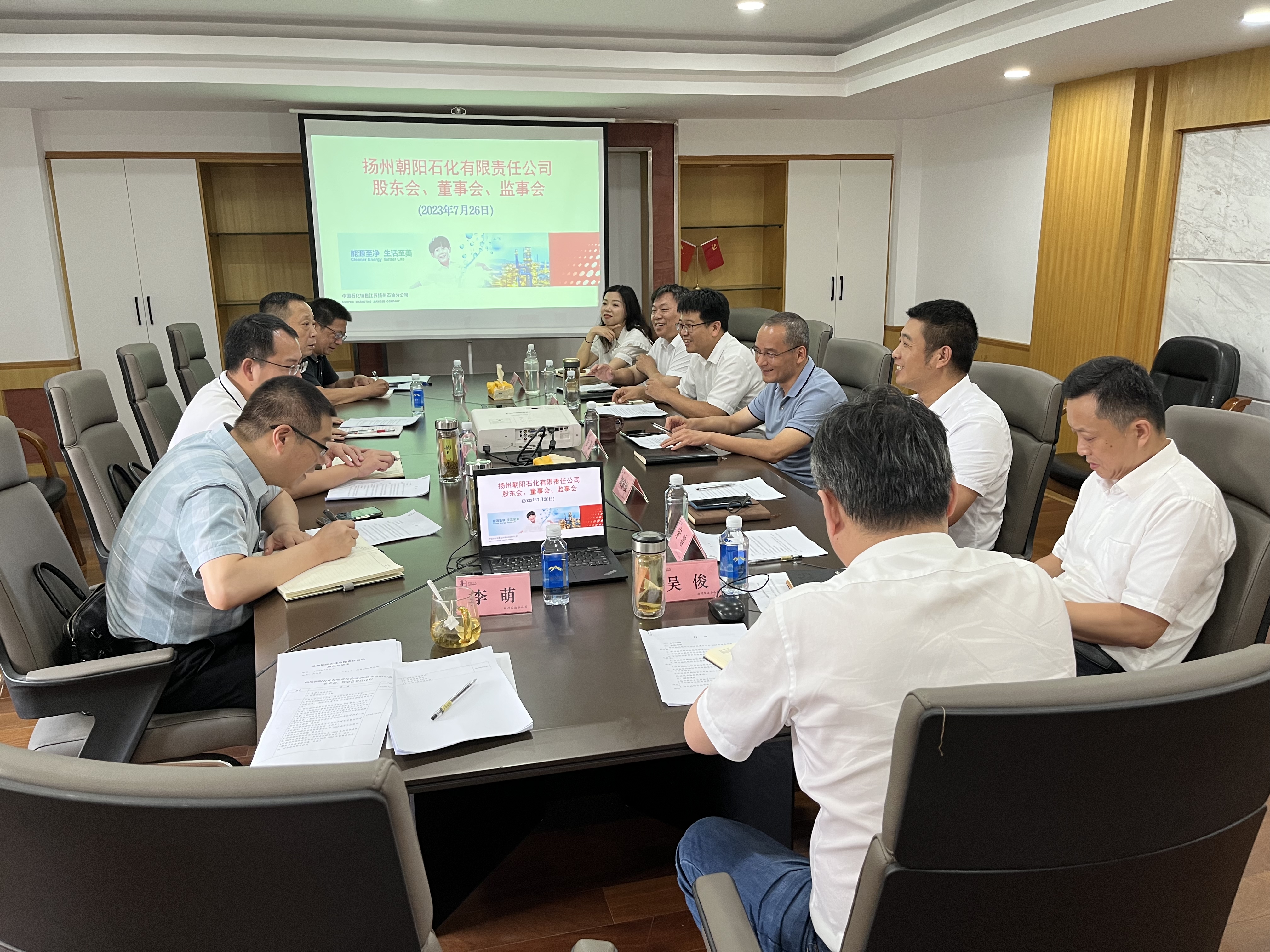 7月26日,揚州朝陽石化有限責(zé)任公司及其股東單位中石化江蘇揚州石油分公司、揚汽集團(tuán)在中石化江蘇揚州石油分公司313會議室召開了揚州朝陽石化有限責(zé)任公司2023年度股東會、董事會、監(jiān)事會。其股東方代表市交通產(chǎn)業(yè)集團(tuán)副總經(jīng)理、揚汽集團(tuán)黨委書記、董事長龔宇峰,揚汽集團(tuán)副總經(jīng)理孫華出席會議。