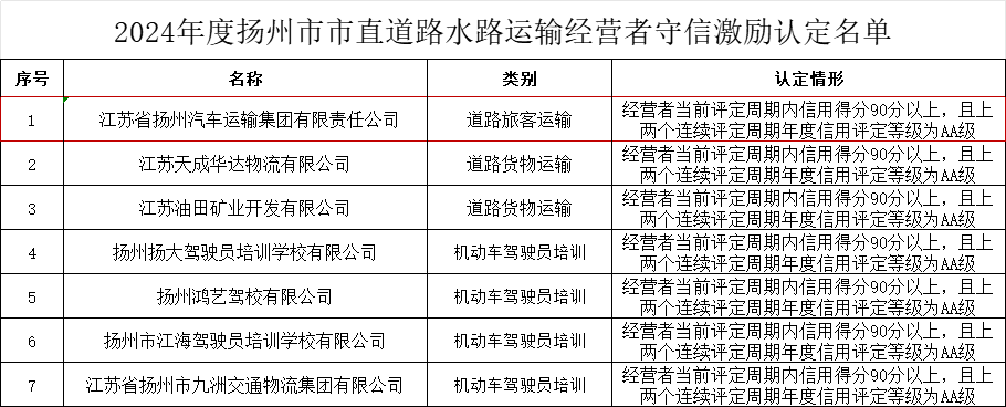 根據(jù)《江蘇省交通運輸行業(yè)信用管理辦法》、《江蘇省道路水路運輸經(jīng)營者信用管理辦法》等文件要求,經(jīng)評審、公示等程序,近日,揚州市交通運輸局發(fā)布認(rèn)定公告,揚汽集團獲2024年度揚州市市直道路運輸經(jīng)營者守信激勵名單認(rèn)定。
